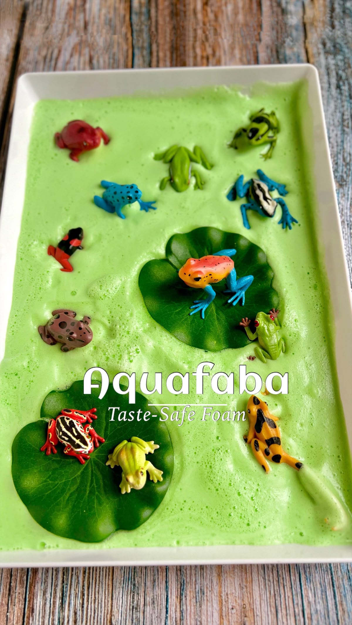 Kids can make wiggly, bouncy “frogs” using aquafaba (the liquid from chickpeas) as a safe, gooey base for sensory play. It’s a messy, tactile activity that’s perfect for exploring textures and having fun with science at the same time! Simply drain a can of chickpeas and reserve the liquid, then whisk on a high speed and add green food dye to make your fluffy green aquafaba.