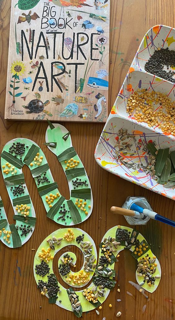 Kids can create slithery snakes using leaves, sunflower seeds, and other bits from nature. It’s a hands-on craft that sparks creativity, teaches about textures, and brings a little outdoor magic indoors!