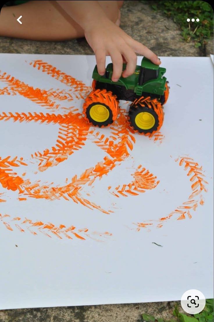 Kids can roll toy tractors through paint and onto paper to create colorful tracks and patterns. It’s a hands-on, playful way to combine vehicles, art, and creativity — perfect for little tractor fans!