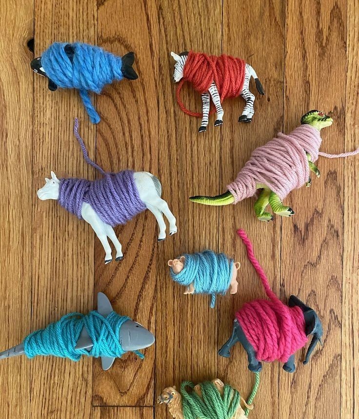Kids can carefully untangle toy animals wrapped in string or yarn. It’s a simple, hands-on activity that builds patience, problem-solving skills, and fine motor coordination — all while having fun rescuing their little friends!