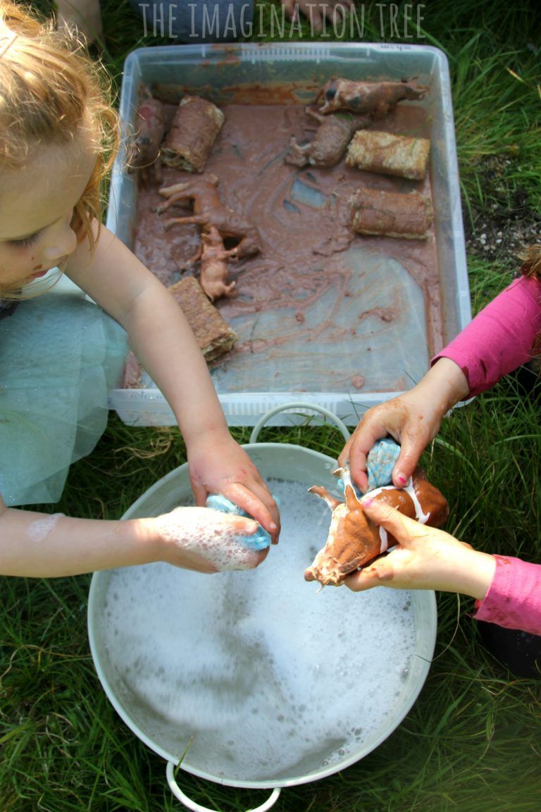 Kids can give their toy farm animals a bubbly bath using soapy water, sponges, or brushes. It’s a simple, hands-on activity that’s both playful and sensory — plus, it sneaks in some fine motor practice!
