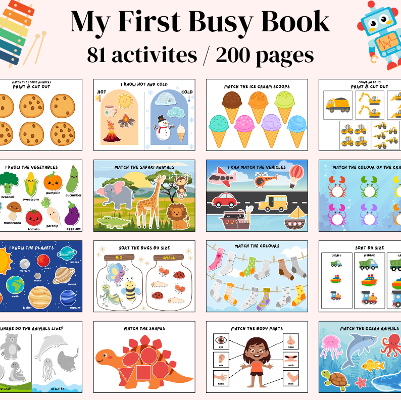 My First Busy Book is a beautifully designed, printable activity book packed with 81 hands-on activities across 200 pages. It’s created to support early learning skills in toddlers and preschool-aged children — without screens, stress, or complicated prep.