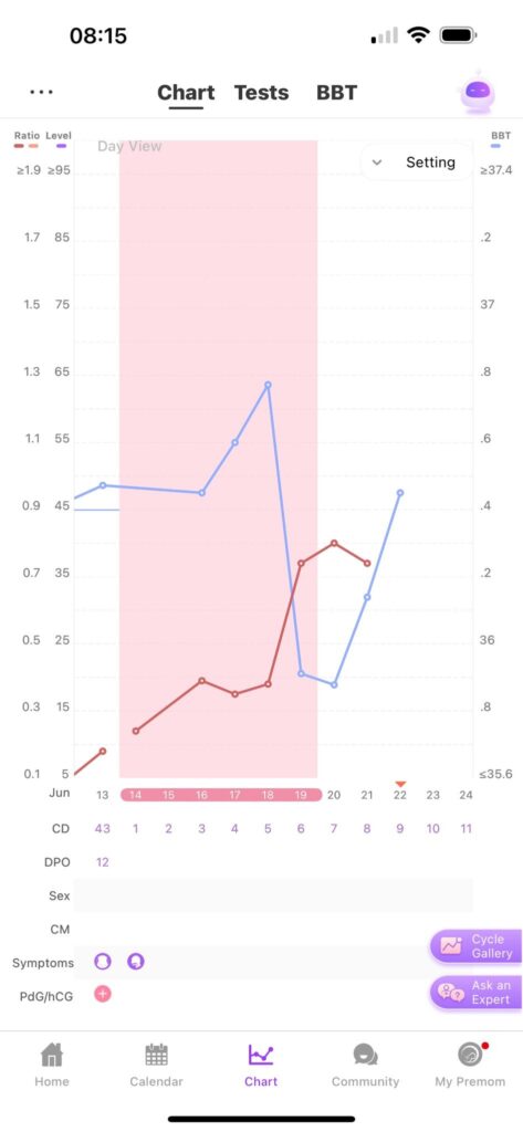 For nearly a year, I tracked my basal body temperature (BBT) while trying to conceive. This simple daily habit gave me deep insight into my cycle. I learned to recognize ovulation when my BBT rose above the cover line. I also knew that a drop two weeks later usually meant my period was about to start. These consistent patterns gave me confidence and clarity during my fertility journey.